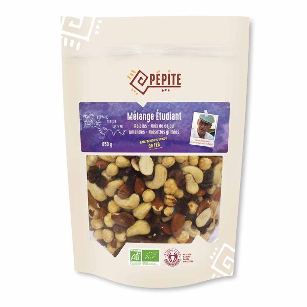 Studenterblandingen er et udvalg af tørrede frugter (rosiner) og nødder (cashewnødder, mandler, ristede hasselnødder), der naturligt er rige på jern.