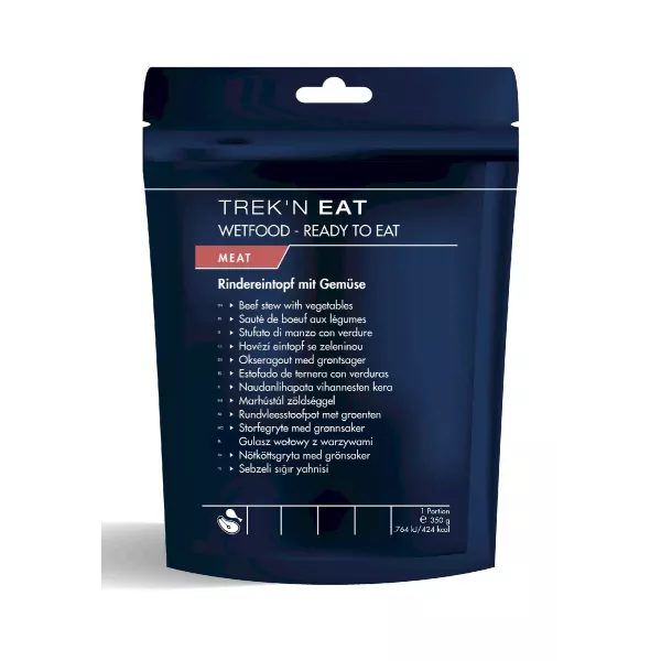 Opskriften giver 423 Kcal og er pakket i en blød pose indeholdende en portion på 350 g. Holdbarheden for Trek'n Eats steriliserede retter er 3 år efter fremstilling. De kan derfor opbevares i et køretøj, på kontoret eller derhjemme.