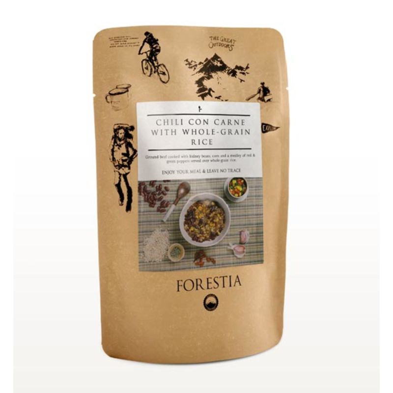 Denne Chili con carne er en steriliseret ret pakket i en pose af mærket Forestia.