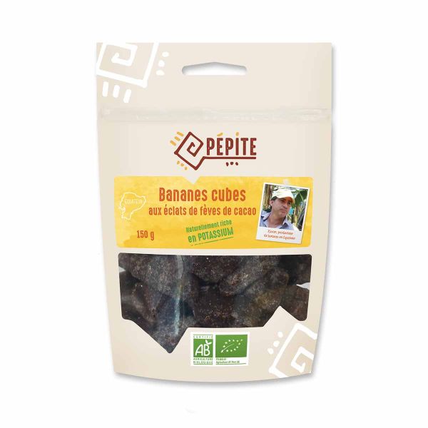 Det franske mærke Pépite arbejder med ham på fair trade-basis for at sikre ham en retfærdig betaling. Når bananerne er for store, for små eller ridset, kan de ikke sælges. Pépite har derfor besluttet at opgradere dem ved at tilbyde disse lækre bidder, der omslutter en kakaobønne. Dette giver en sund snack, der er ideel til at stille sulten på vandreture.
